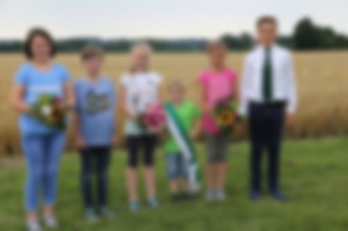 vlnr: Ehrendame Franziska David, Ehrenherr Robin Frieling, Königin Franziska Klümper, König Fabian David, Ehrendame Heike Wittkamp, Ehrenherr Sven Klümper